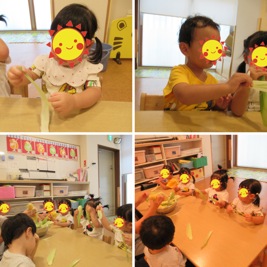 とうもろこしの皮むきを行いました。